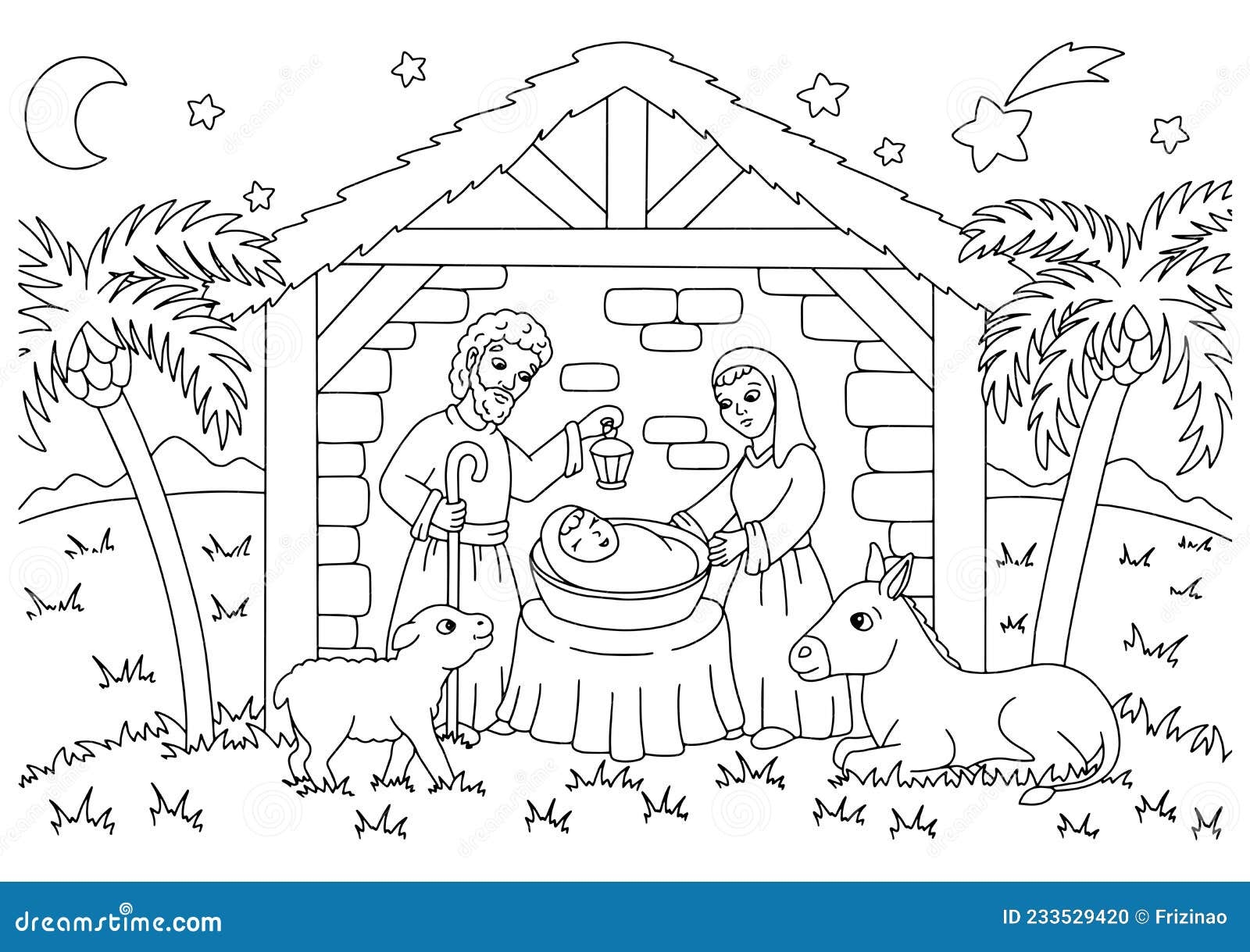 Nativity Scene Coloring Book Page For Kids Cartoon Style Character Stock Vector Illustration Of Sketch Isolated 233529420